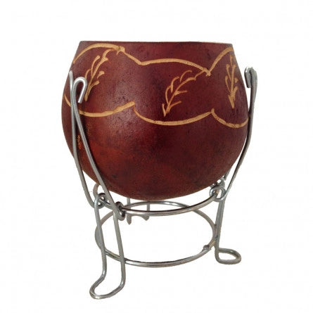 Mate tallado a mano hecho artesanalmente con calabazas naturales. El producto tiene una estructura metálica que le sirve de sujeción y de pie para poder apoyarla en superficies planas. Ideal para infusiones.